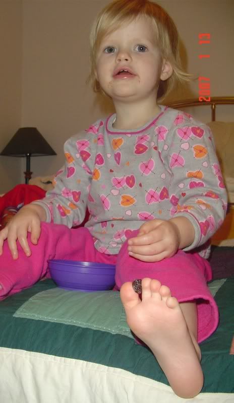So without further rambling, I introduce her to you...the amazingly flexible child who eats raisins with her toes. I assure you, I did not initiate this, she came up with it all on her own. And being the good mother that I am, rather than discouraging such behavior, I took pictures.